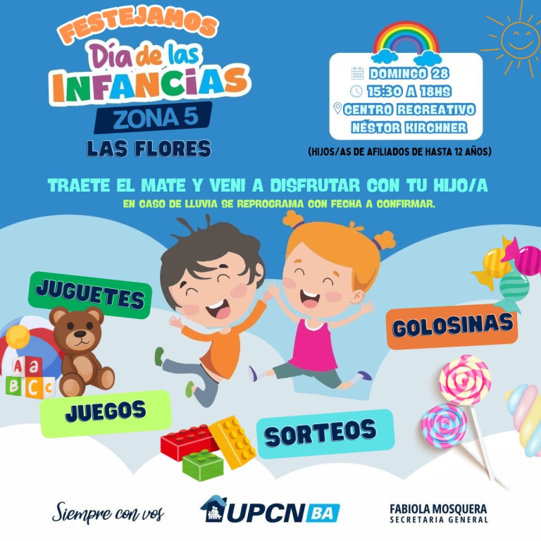 UPCNBA Las Flores, celebra el Día de las Infancias el próximo domingo 28 de septiembre a partir de las 15.30hs hasta las 18hs en el Centro Recreativo Néstor Kirchner.