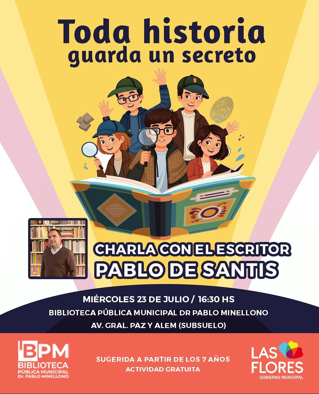 Pablo de Santis, autor de numerosas novelas, historietas y cuentos juveniles, nos visitará en Las Flores para compartir con el público su experiencia secreta, uniendo imaginación y escritura para contar historias divertidas y atrapantes.