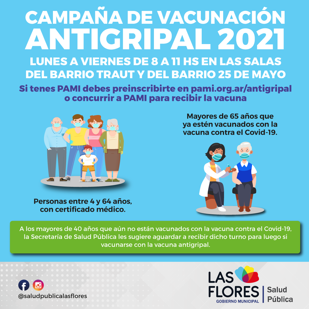 Desde el lunes lo hará, de lunes a viernes de 8 a 11 hs, en las Salas del Barrio Traut y del Barrio 25 de Mayo, a los siguientes grupos poblacionales, personas entre 4 y 64 años, con certificado médico (excluyente) y mayores de 65 años y que ya estén vacunados con la vacuna contra el Covid-19.